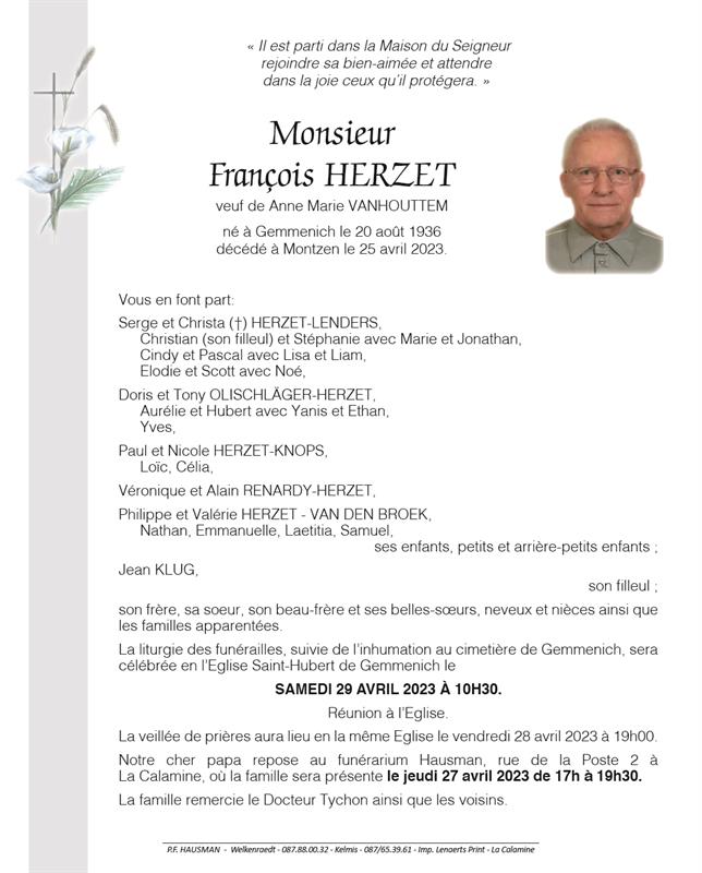 Fallecido en Montzen (4850) el martes, 25 de abril de 2023 a la edad de 86 años