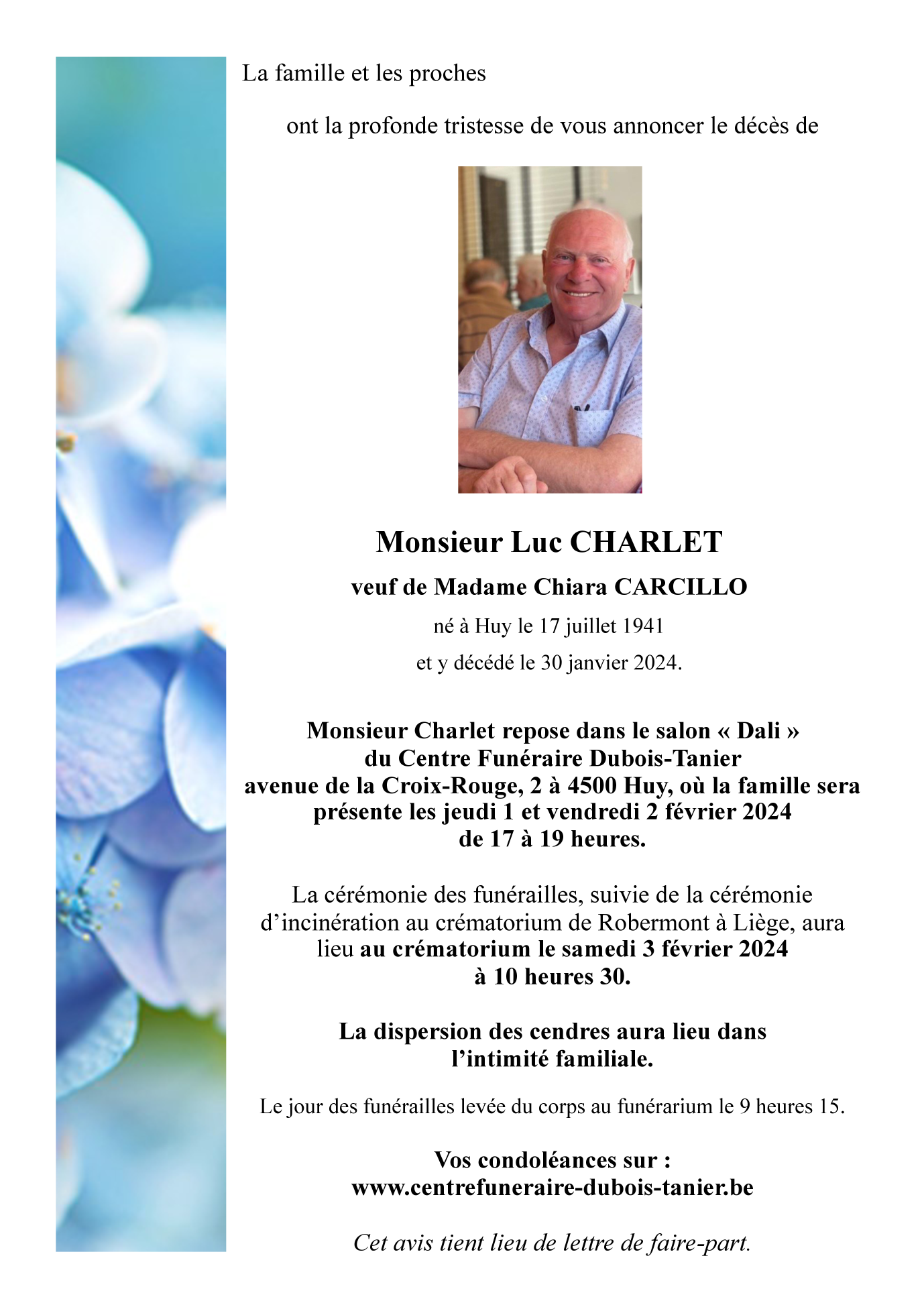 Décédé à Huy (4500) le mardi 30 janvier 2024 à l'âge de 82 ans