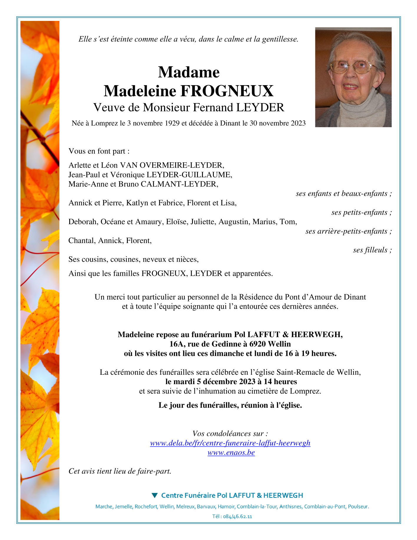 Décédée à Dinant (5500) le jeudi 30 novembre 2023 à l'âge de 94 ans