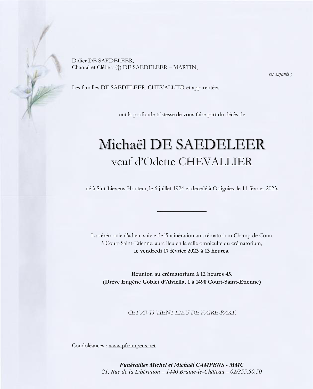 Décédé à Ottignies (1340) le samedi 11 février 2023 à l'âge de 98 ans