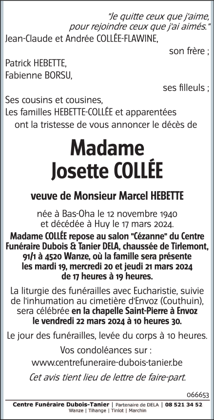 Décédée à Huy (4500) le dimanche 17 mars 2024 à l'âge de 83 ans