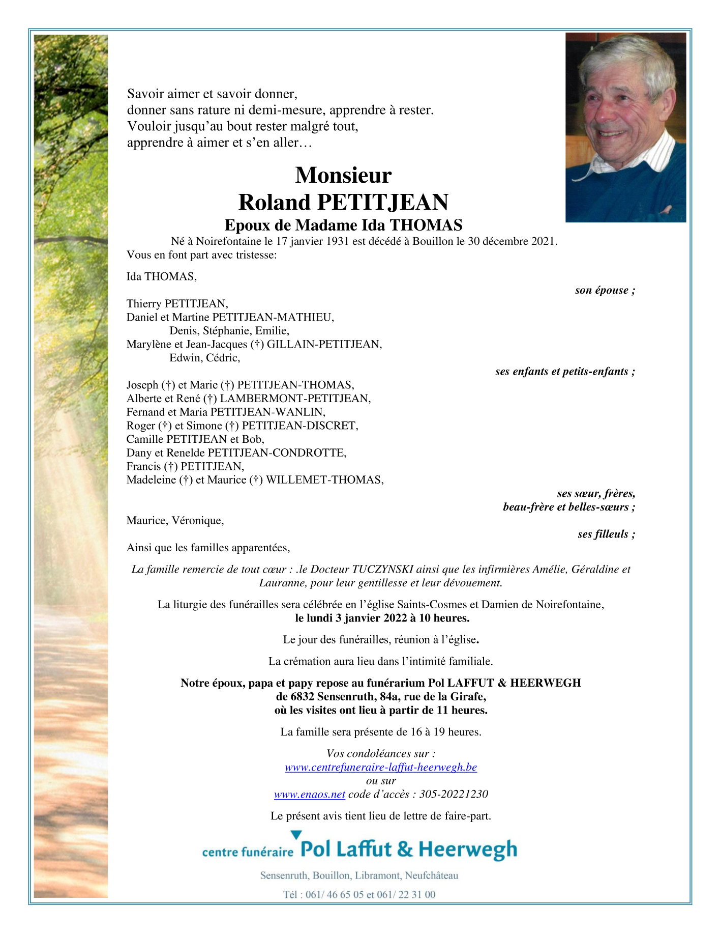 Décédé à Bouillon (6830) le jeudi 30 décembre 2021 à l'âge de 90 ans