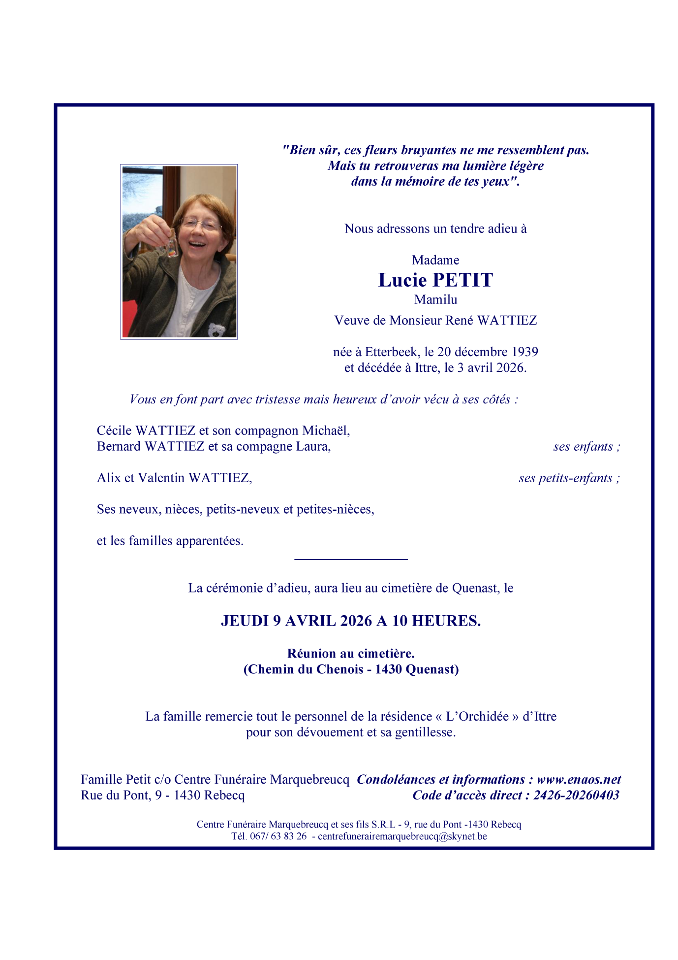 Décédée à Ittre (1460) le vendredi 3 avril 2026 à l'âge de 86 ans