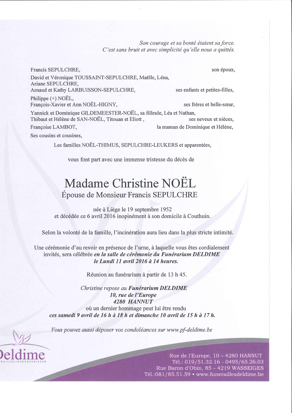 Fallecida en Couthuin (4218) el miércoles, 6 de abril de 2016 a la edad de 63 años