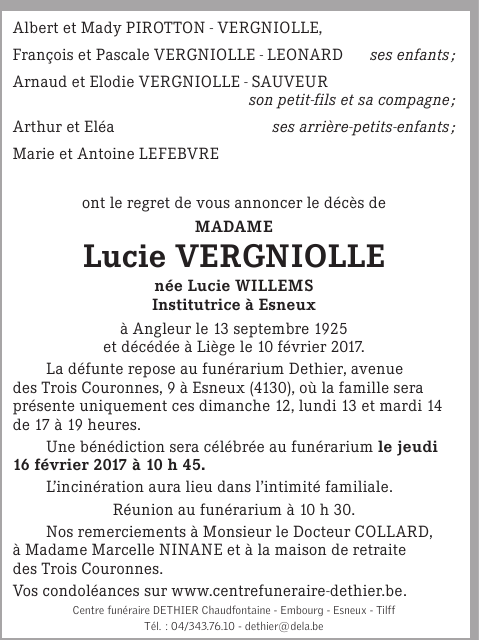 Overleden te Liège (4000) op vrijdag 10 februari 2017 op 91-jarige leeftijd