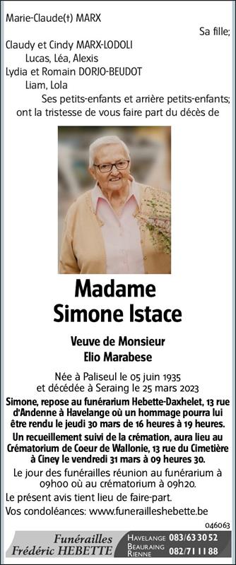 Décédée à Seraing (4100) le samedi 25 mars 2023 à l'âge de 87 ans
