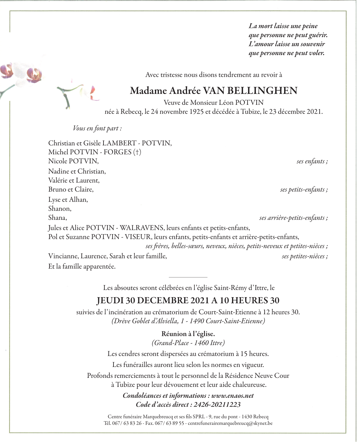 Décédée à Tubize (1480) le jeudi 23 décembre 2021 à l'âge de 96 ans