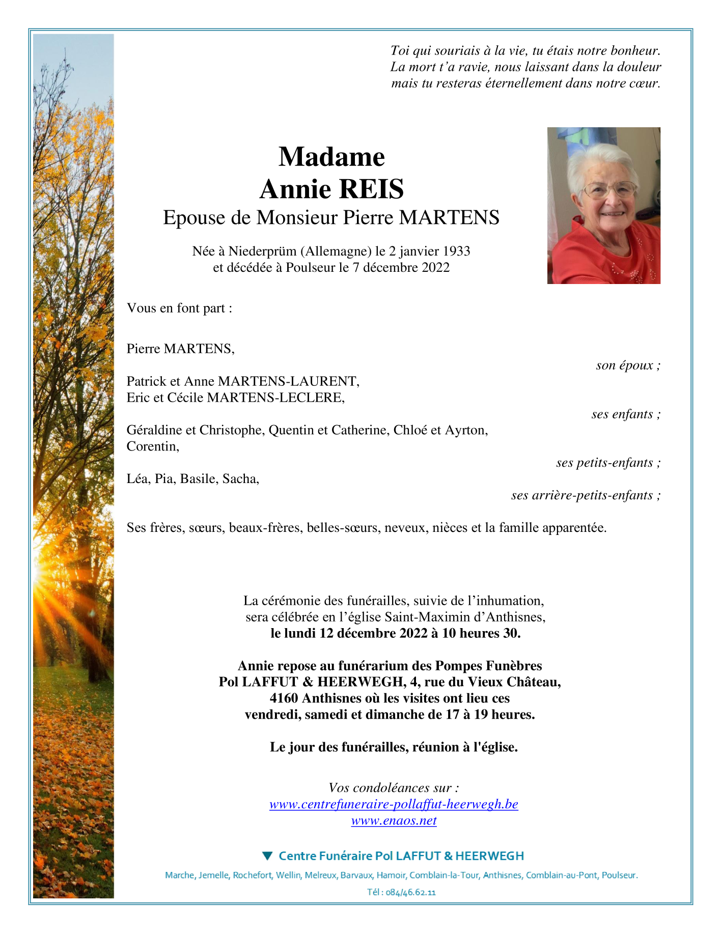 Décédée à Poulseur (4171) le mercredi 7 décembre 2022 à l'âge de 89 ans