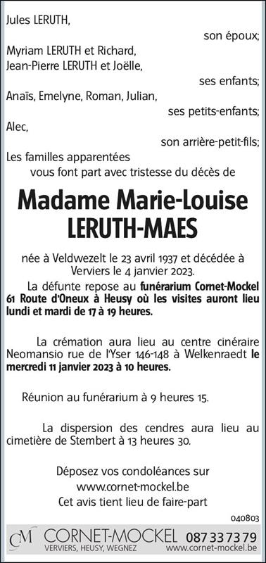 Décédée à Verviers (4800) le mercredi 4 janvier 2023 à l'âge de 85 ans