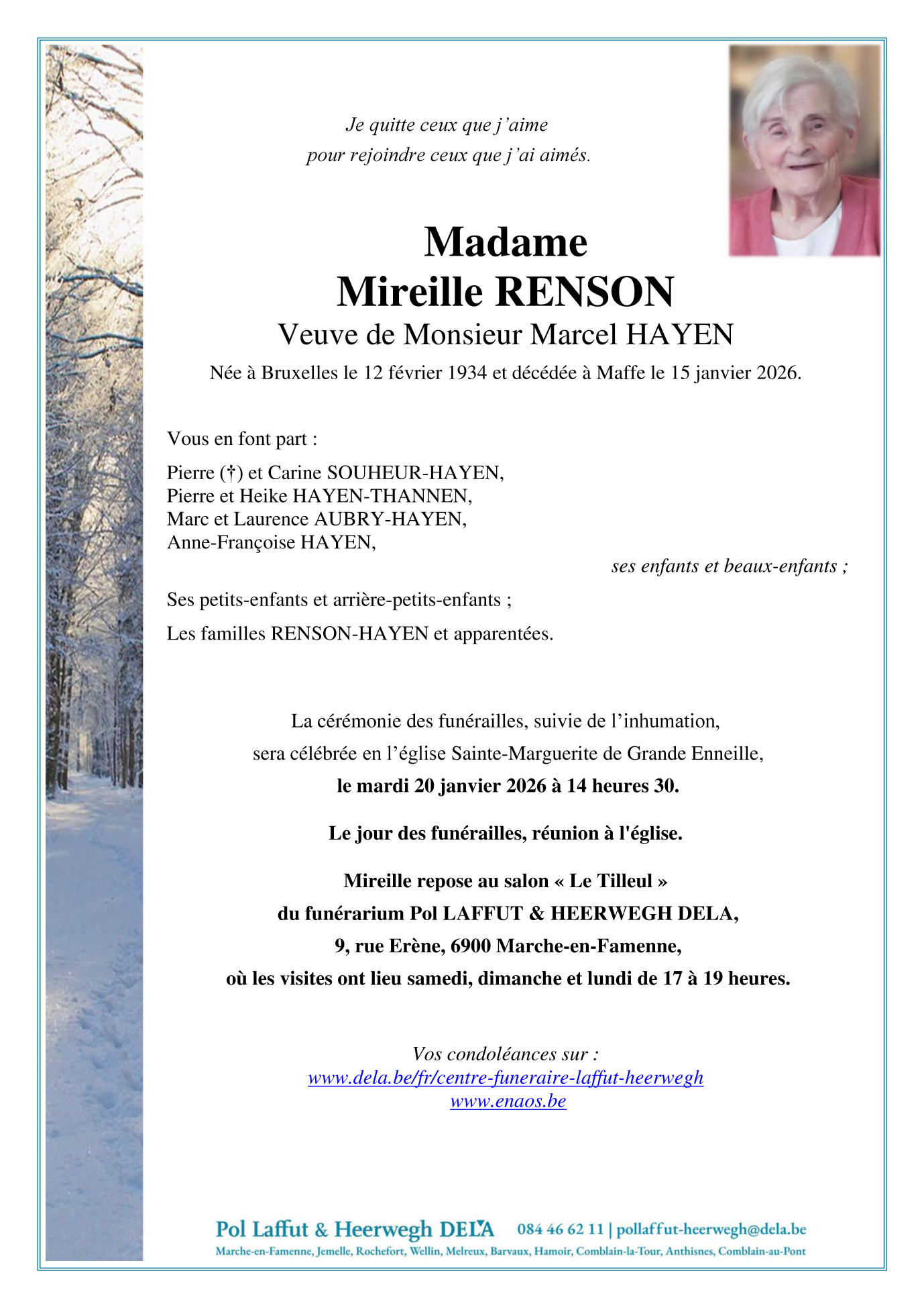 Décédée à Maffe (5374) le jeudi 15 janvier 2026 à l'âge de 91 ans