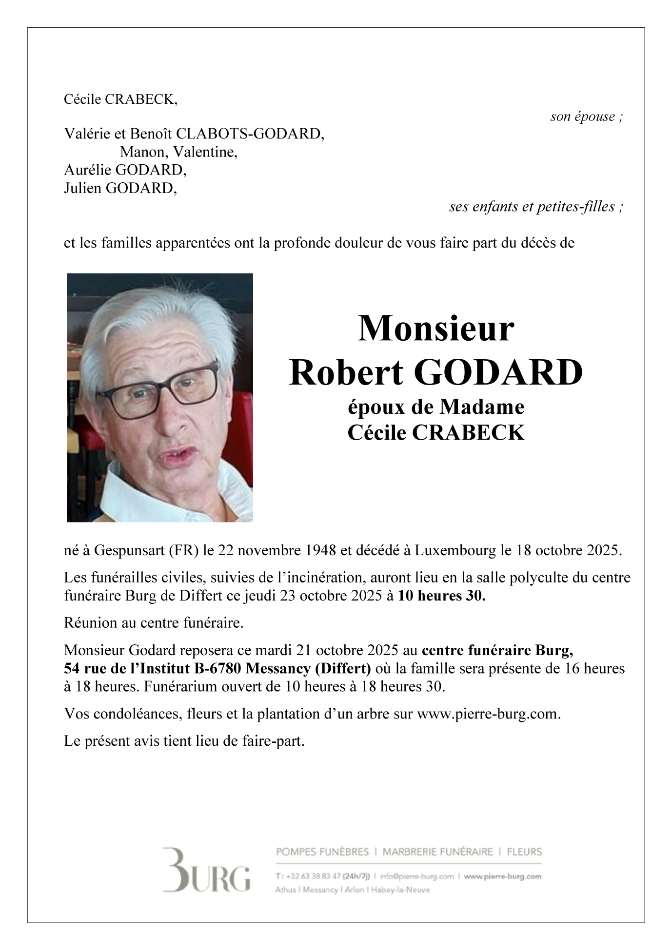 Overleden te Luxembourg/Barble  (1210, Luxembourg) op zaterdag 18 oktober 2025 op 76-jarige leeftijd