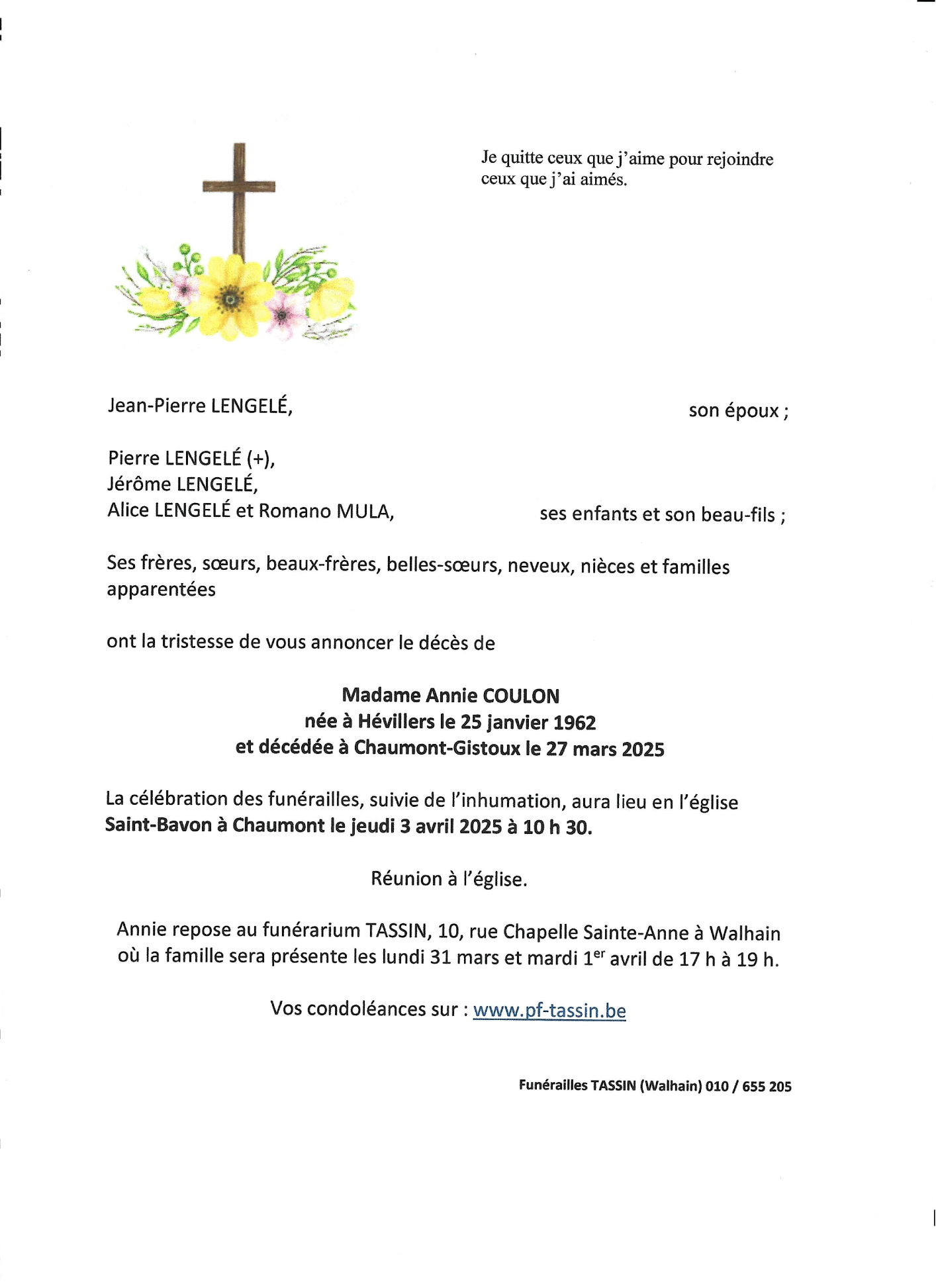 Décédée à Bonlez (1325) le jeudi 27 mars 2025 à l'âge de 63 ans