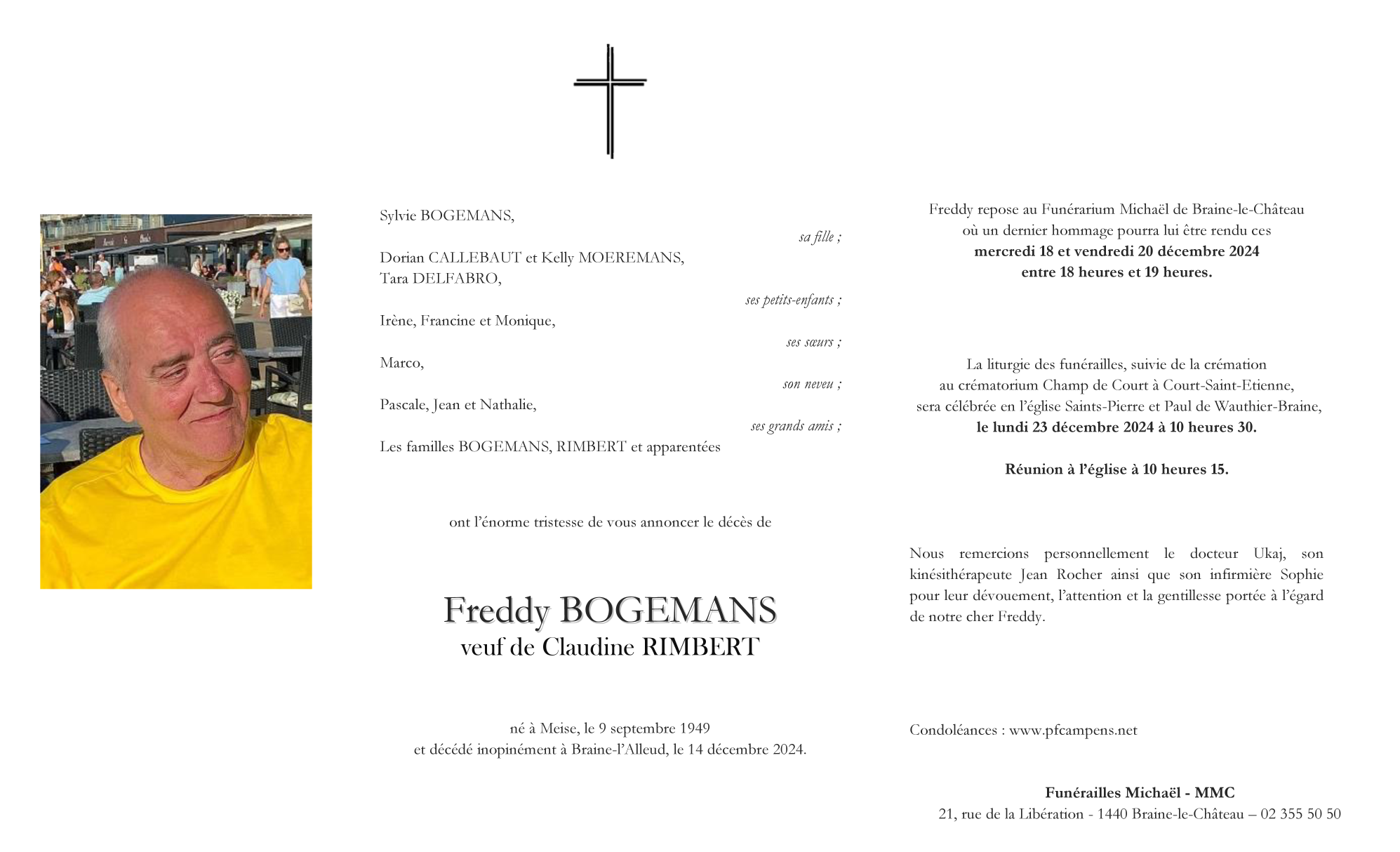 Décédé à Braine-l'Alleud (1420) le samedi 14 décembre 2024 à l'âge de 75 ans
