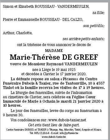 Overleden te Clavier (4560) op vrijdag 17 januari 2020 op 94-jarige leeftijd