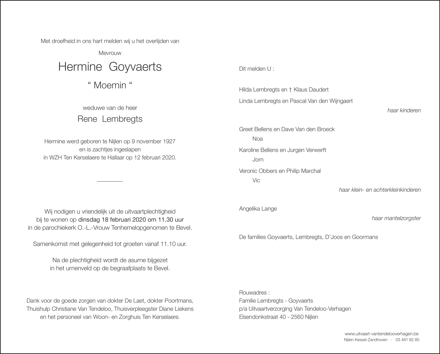 Overleden te Hallaar (2220) op woensdag 12 februari 2020 op 92-jarige leeftijd