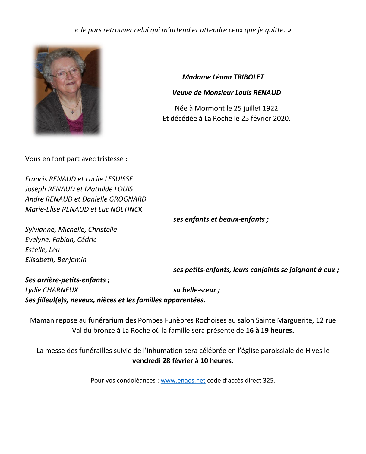 Décédée à La Roche-en-Ardenne (6980) le mardi 25 février 2020 à l'âge de 97 ans
