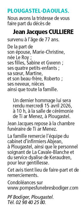 Overleden te Brest (29200, Frankrijk) op zaterdag 11 april 2026 op 77-jarige leeftijd
