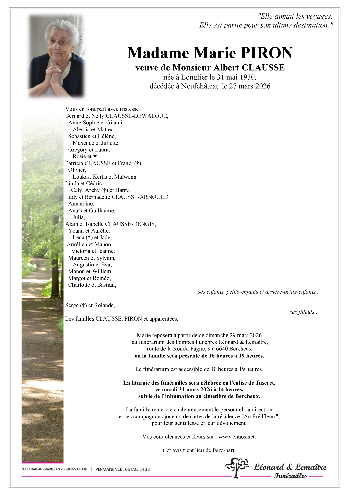 Décédée à Neufchâteau (6840) le vendredi 27 mars 2026 à l'âge de 95 ans