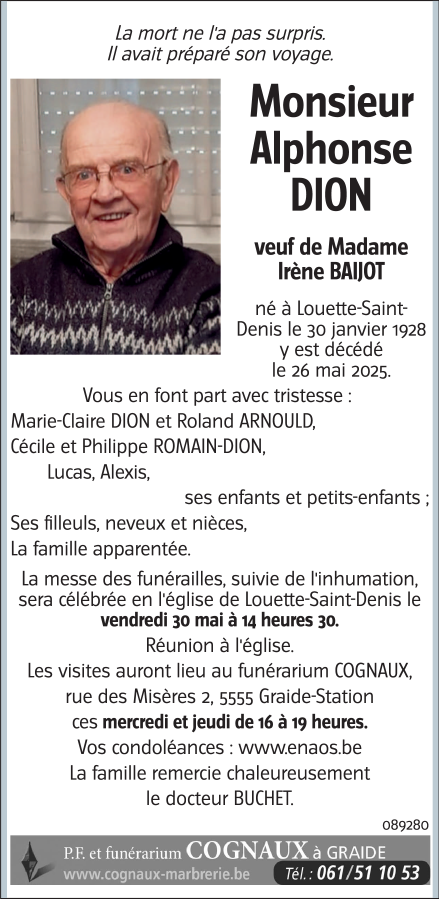 Died in Louette-Saint-Denis (5575) on 26 May 2025 at the age of 97 years