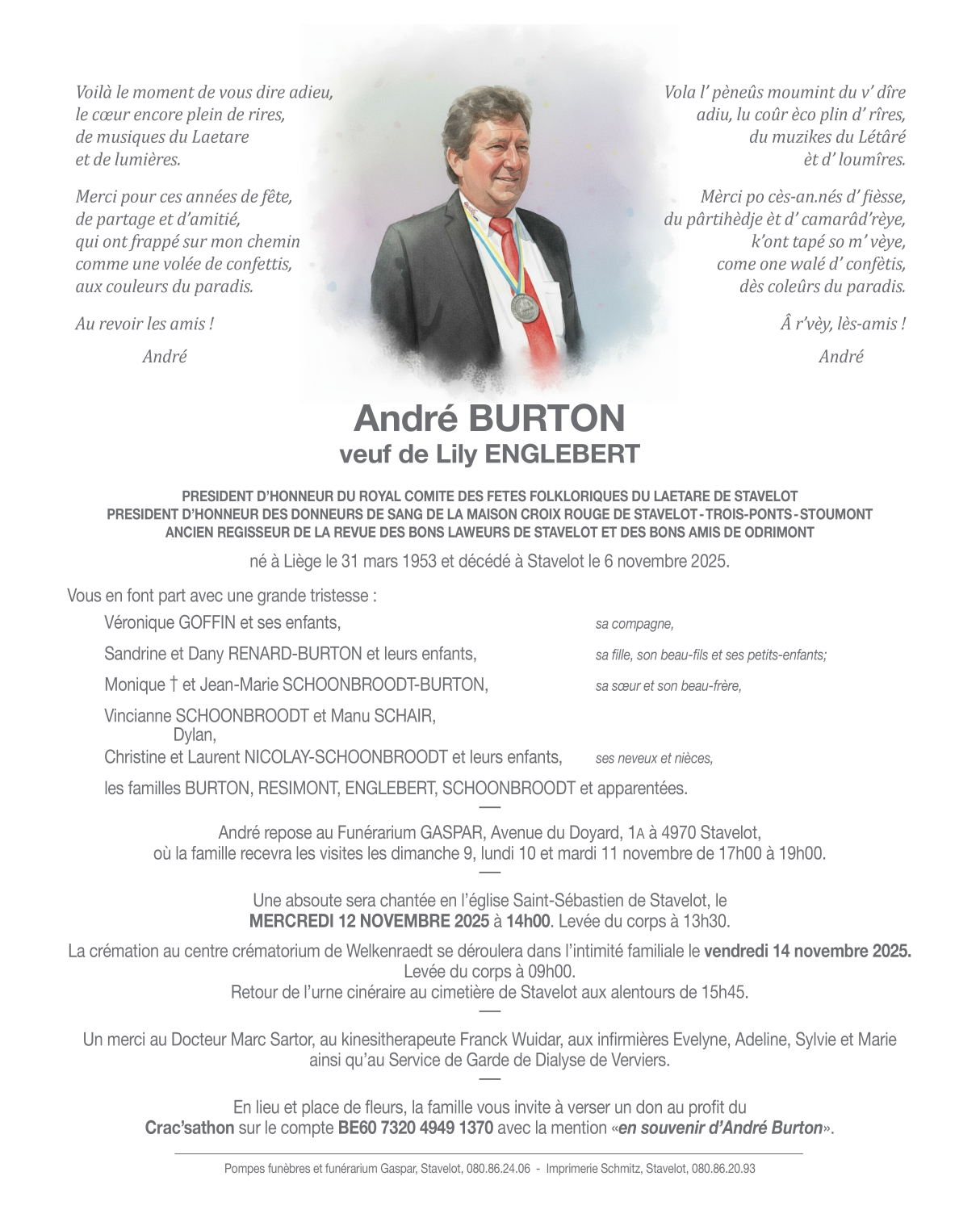 Fallecido en Stavelot (4970) el jueves, 6 de noviembre de 2025 a la edad de 72 años