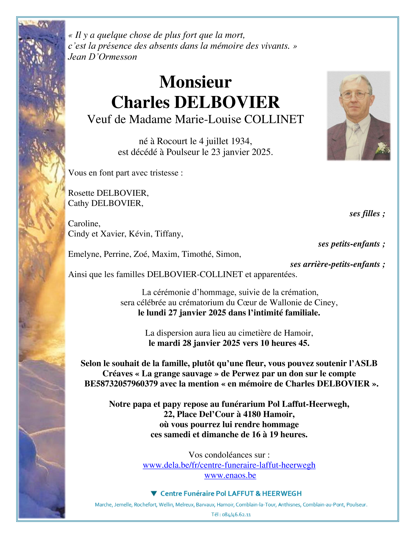 Décédé à Poulseur (4171) le jeudi 23 janvier 2025 à l'âge de 90 ans