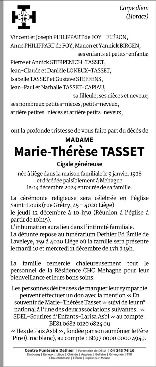Décédée à Embourg (4053) le mercredi 4 décembre 2024 à l'âge de 96 ans