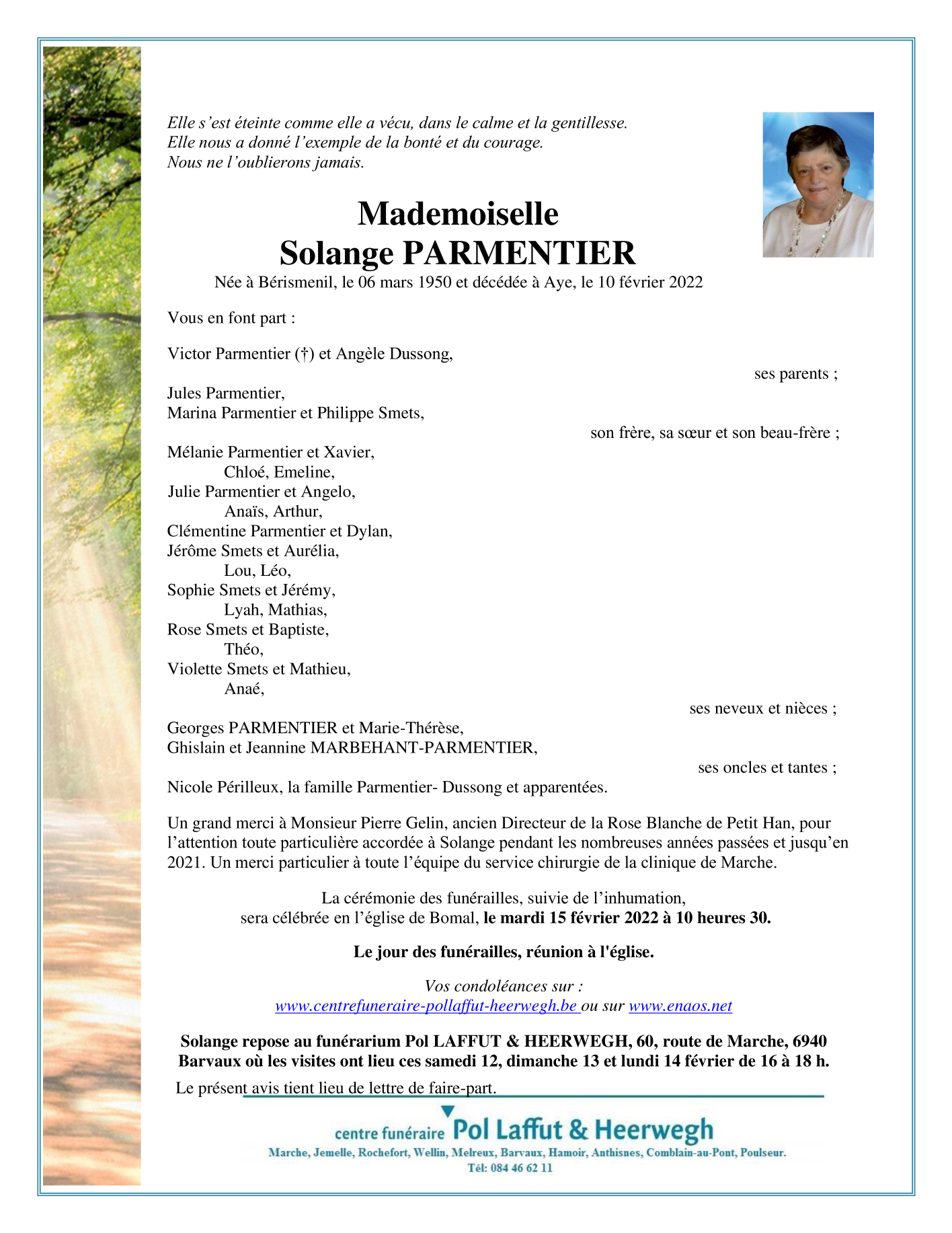 Fallecida en Marche-en-Famenne (6900) el jueves, 10 de febrero de 2022 a la edad de 71 años