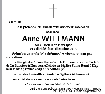 Fallecida en Uccle (1180) el lunes, 31 de diciembre de 2018 a la edad de 83 años