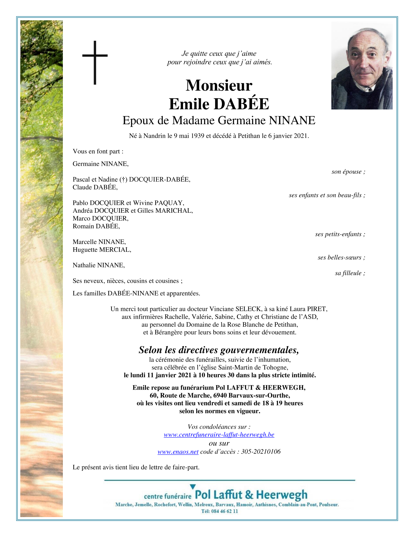 Décédé à Petit-Han (6940) le mercredi 6 janvier 2021 à l'âge de 81 ans