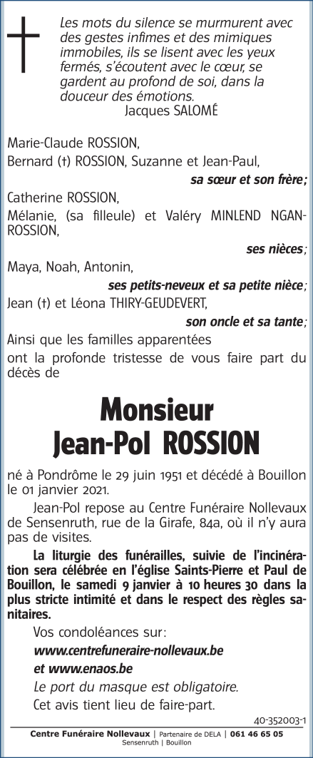 Décédé à Bouillon (6830) le vendredi 1 janvier 2021 à l'âge de 69 ans
