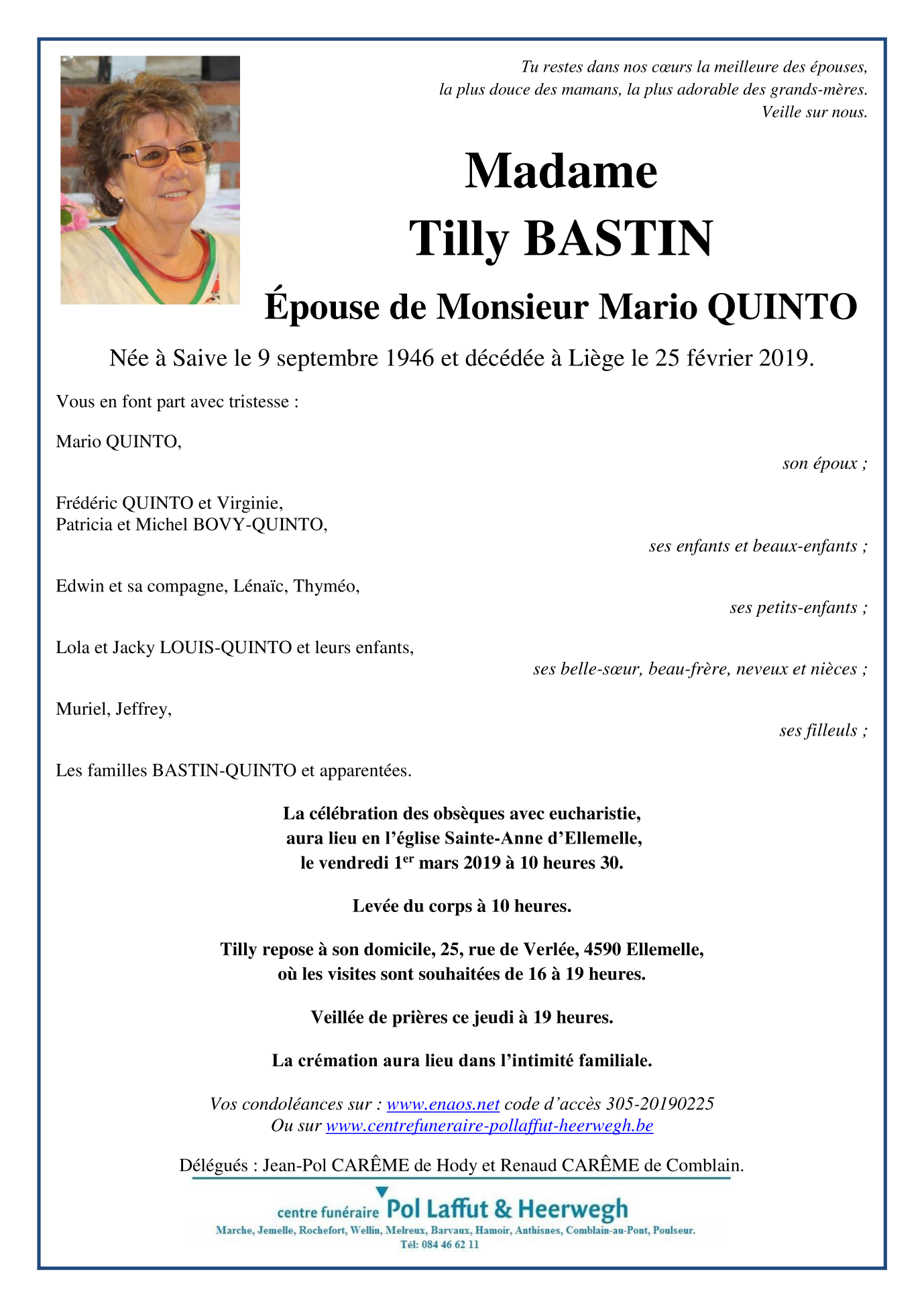 Décédée à Liège (4000) le lundi 25 février 2019 à l'âge de 72 ans