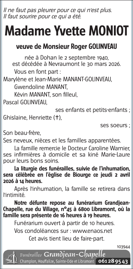 Overleden te Nevraumont (6880) op maandag 30 maart 2026 op 85-jarige leeftijd