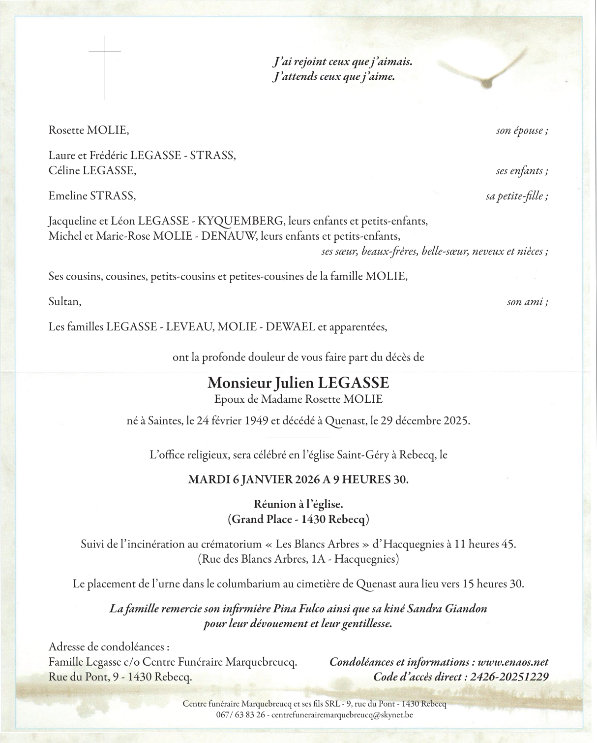 Décédé à Quenast (1430) le lundi 29 décembre 2025 à l'âge de 76 ans