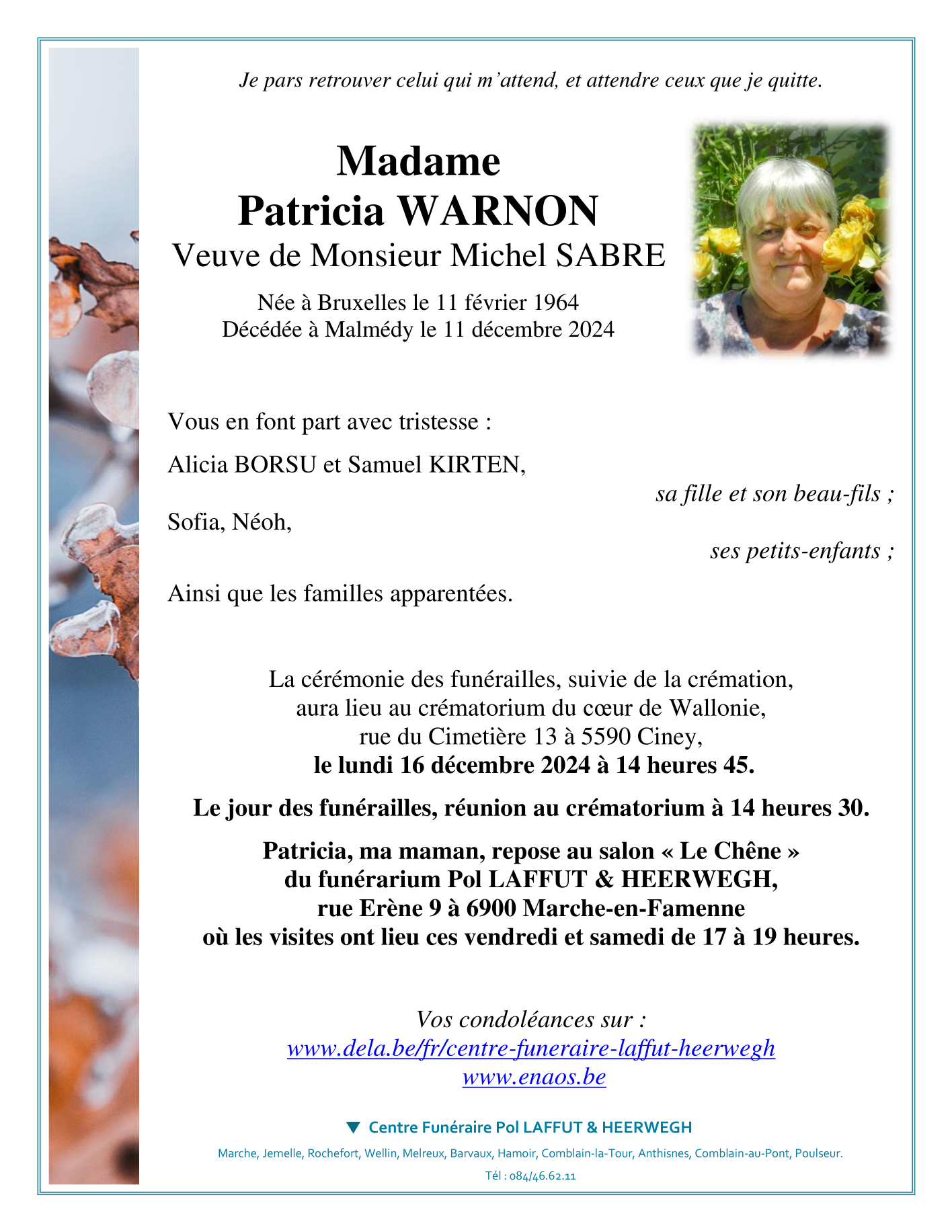 Fallecida en Malmedy (4960) el miércoles, 11 de diciembre de 2024 a la edad de 60 años