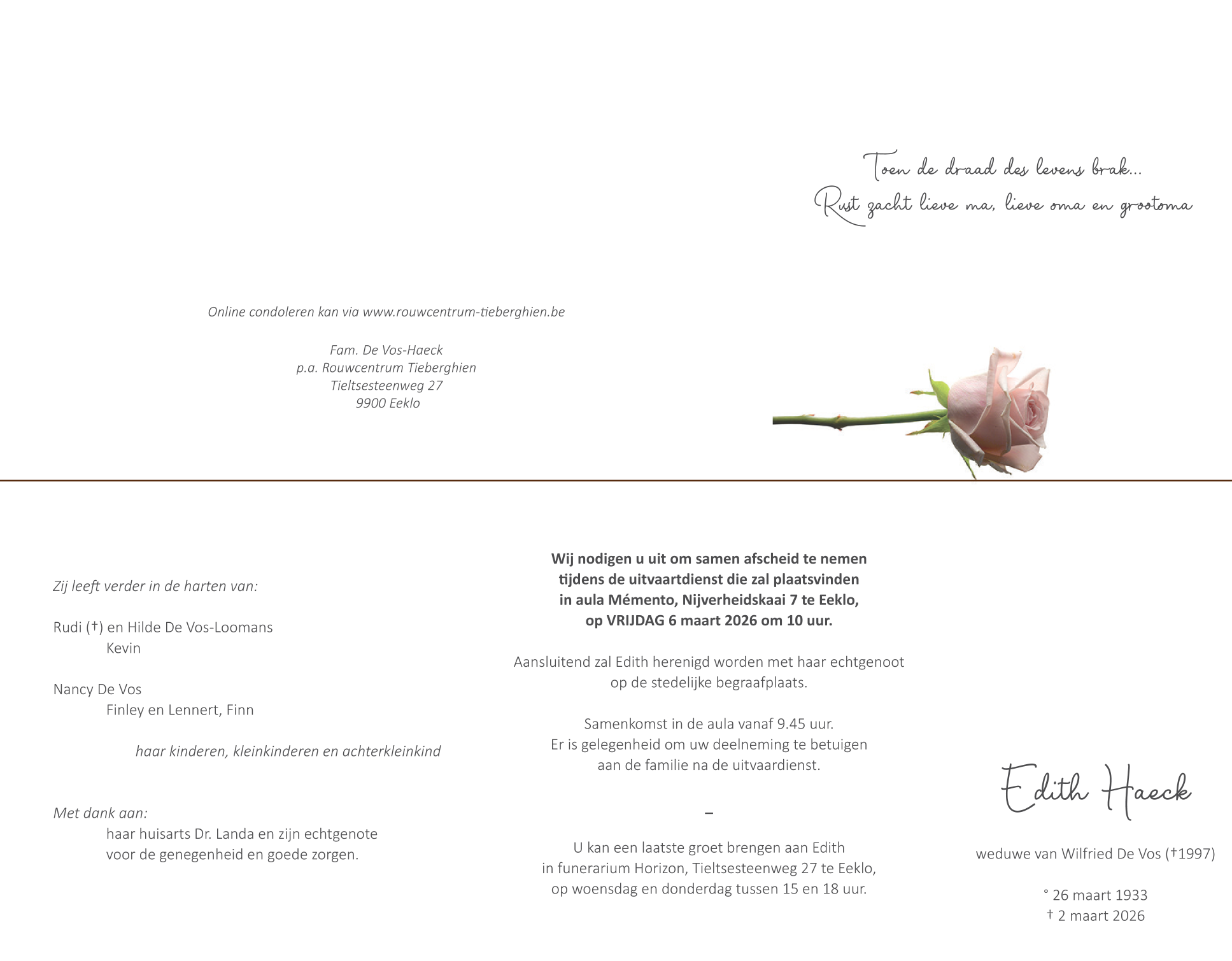 Décédée à Eeklo (9900) le lundi 2 mars 2026 à l'âge de 92 ans