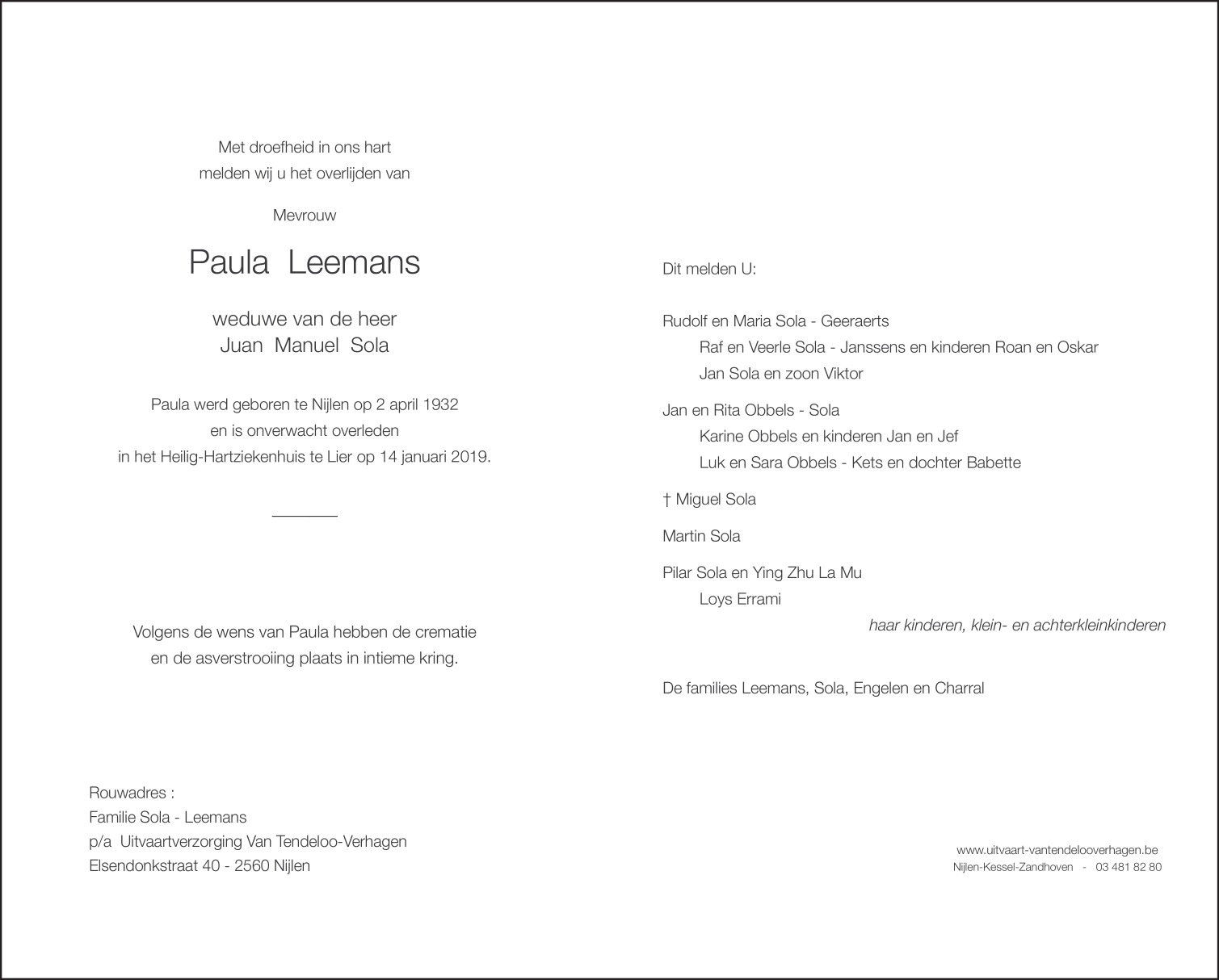Décédée à Lier (2500) le lundi 14 janvier 2019 à l'âge de 86 ans