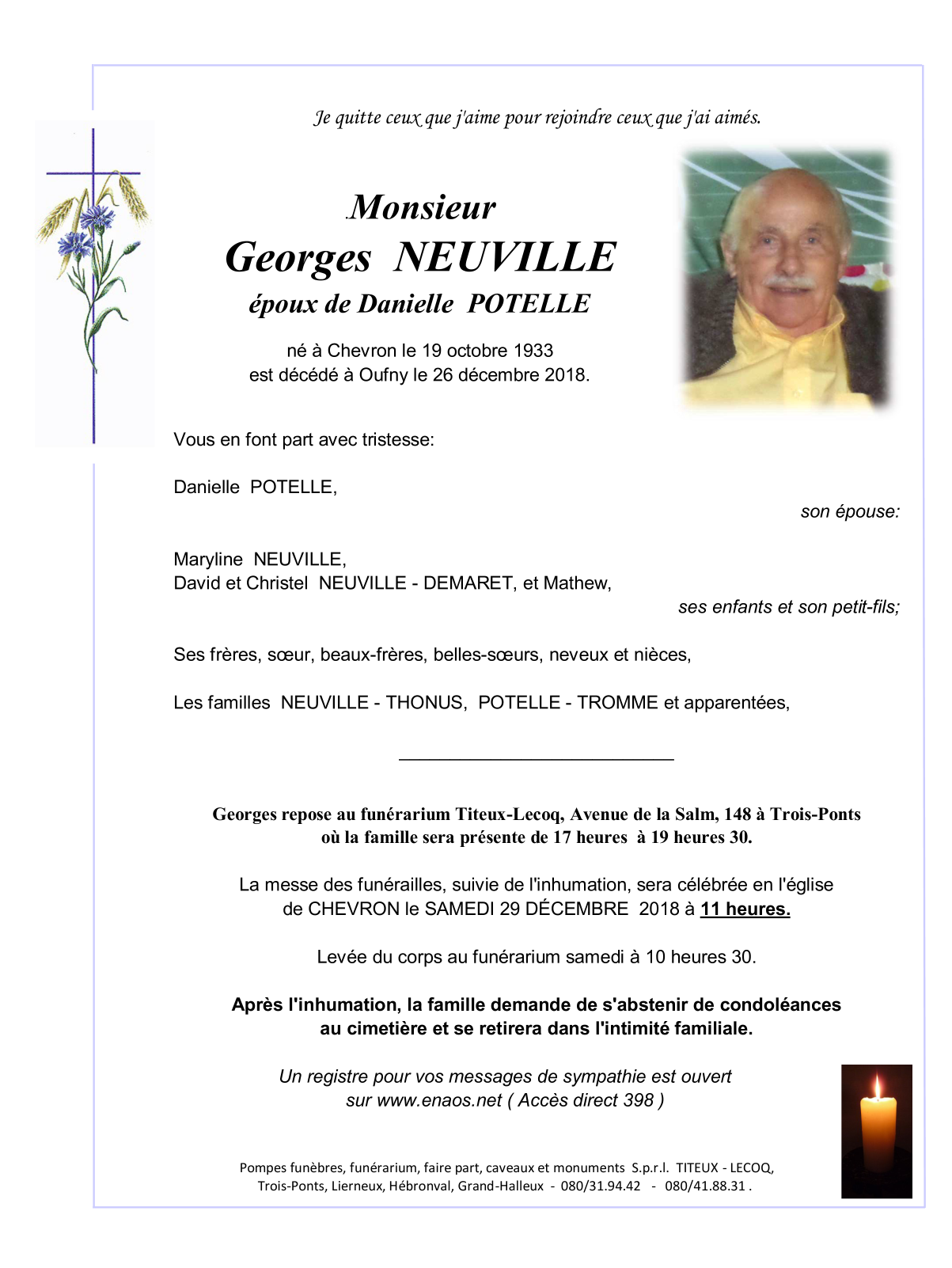 Décédé à Chevron (4987) le mercredi 26 décembre 2018 à l'âge de 85 ans