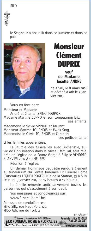Overleden te Silly (7830) op maandag 2 januari 2017 op 88-jarige leeftijd