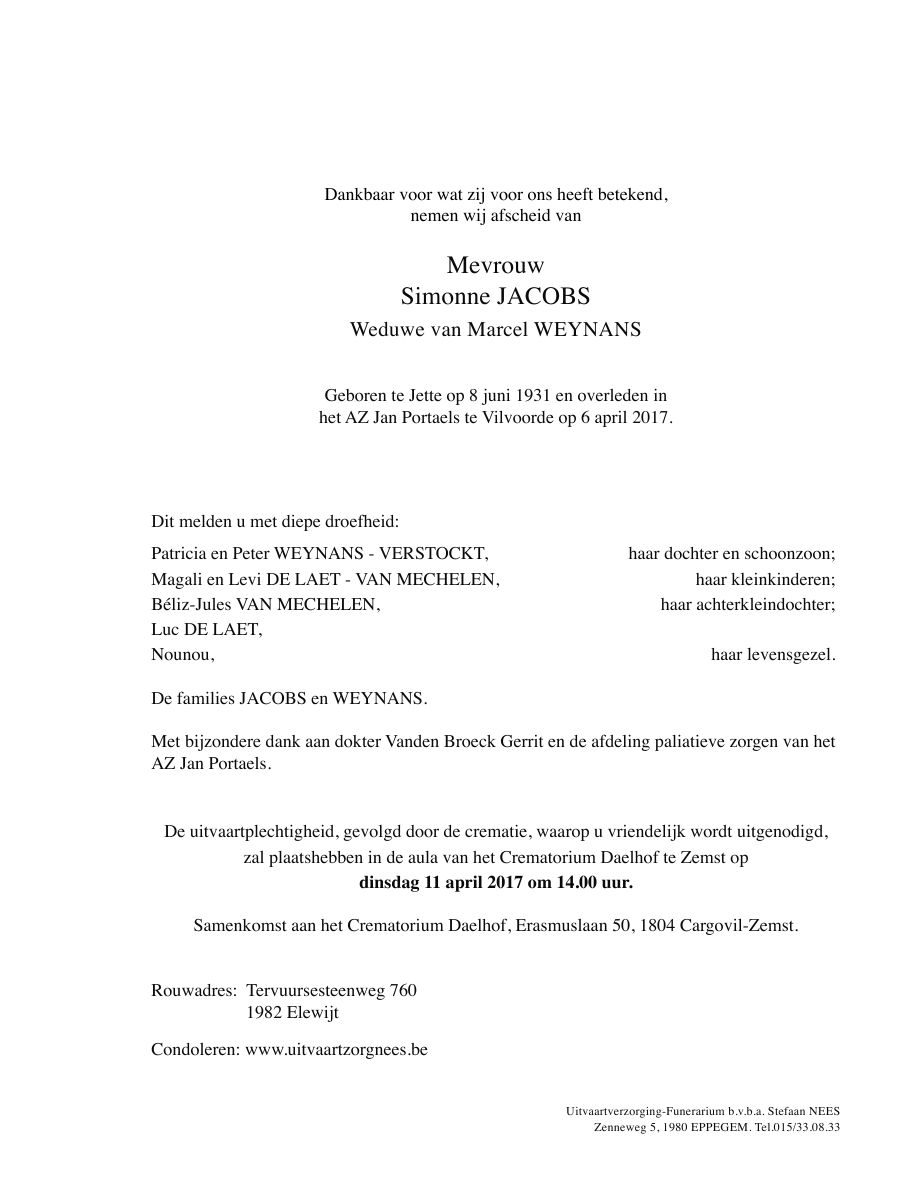 Overleden te Vilvoorde (1800) op donderdag 6 april 2017 op 85-jarige leeftijd