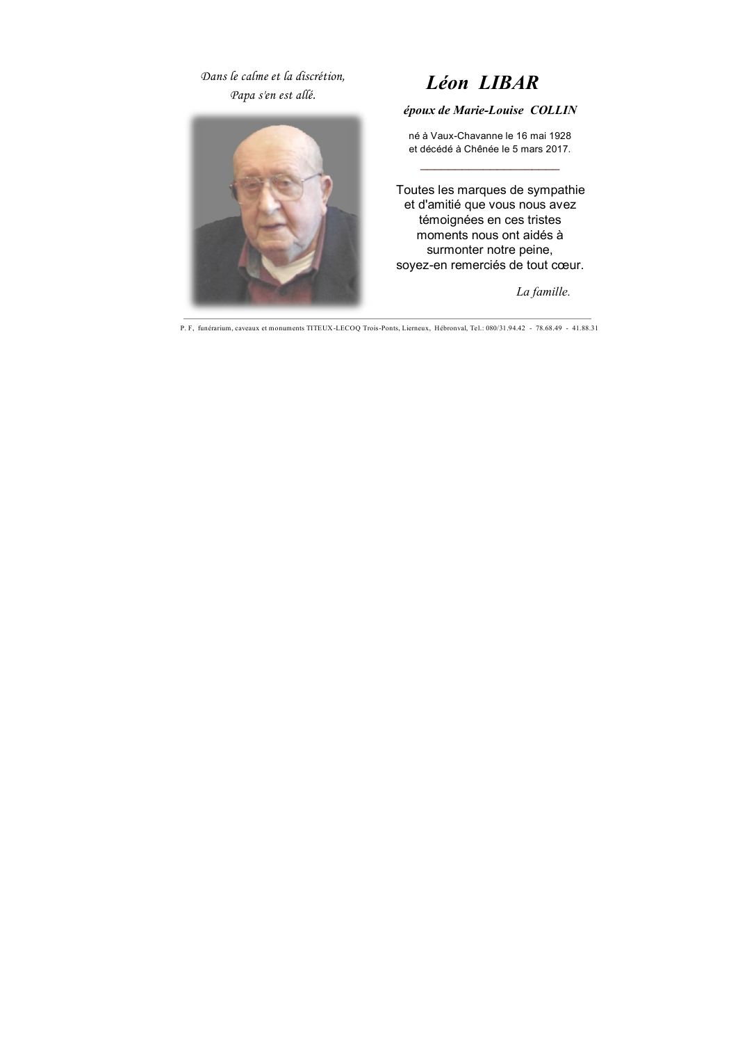 Décédé à Chênée (4032) le dimanche 5 mars 2017 à l'âge de 88 ans