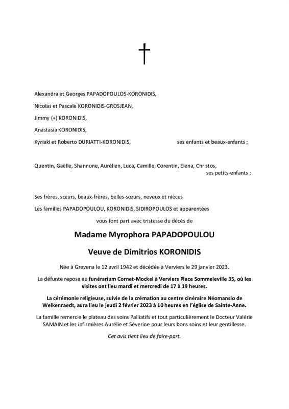 Widow of Monsieur Dimitrios KORONIDIS