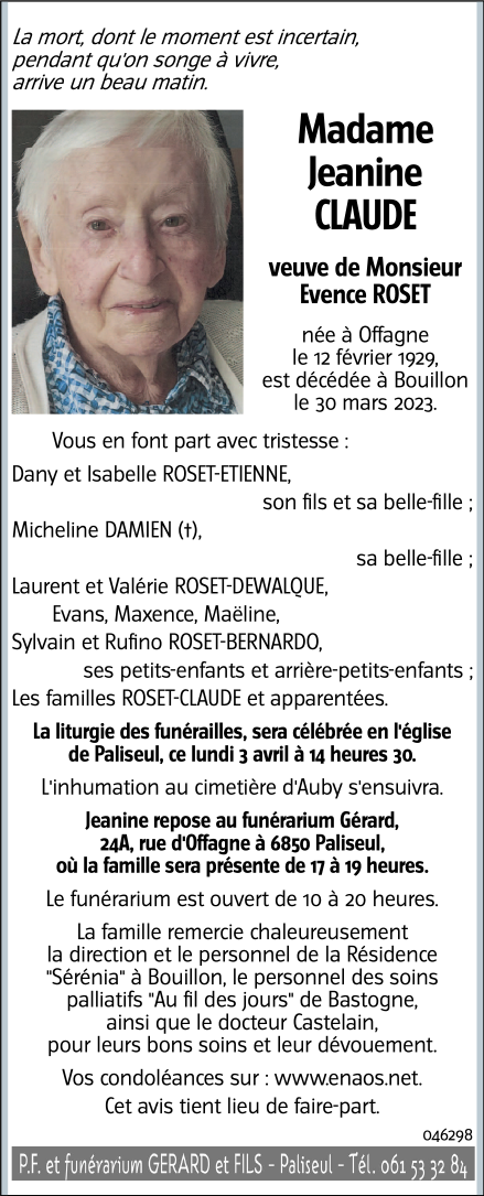 Décédée à Bouillon (6830) le jeudi 30 mars 2023 à l'âge de 94 ans