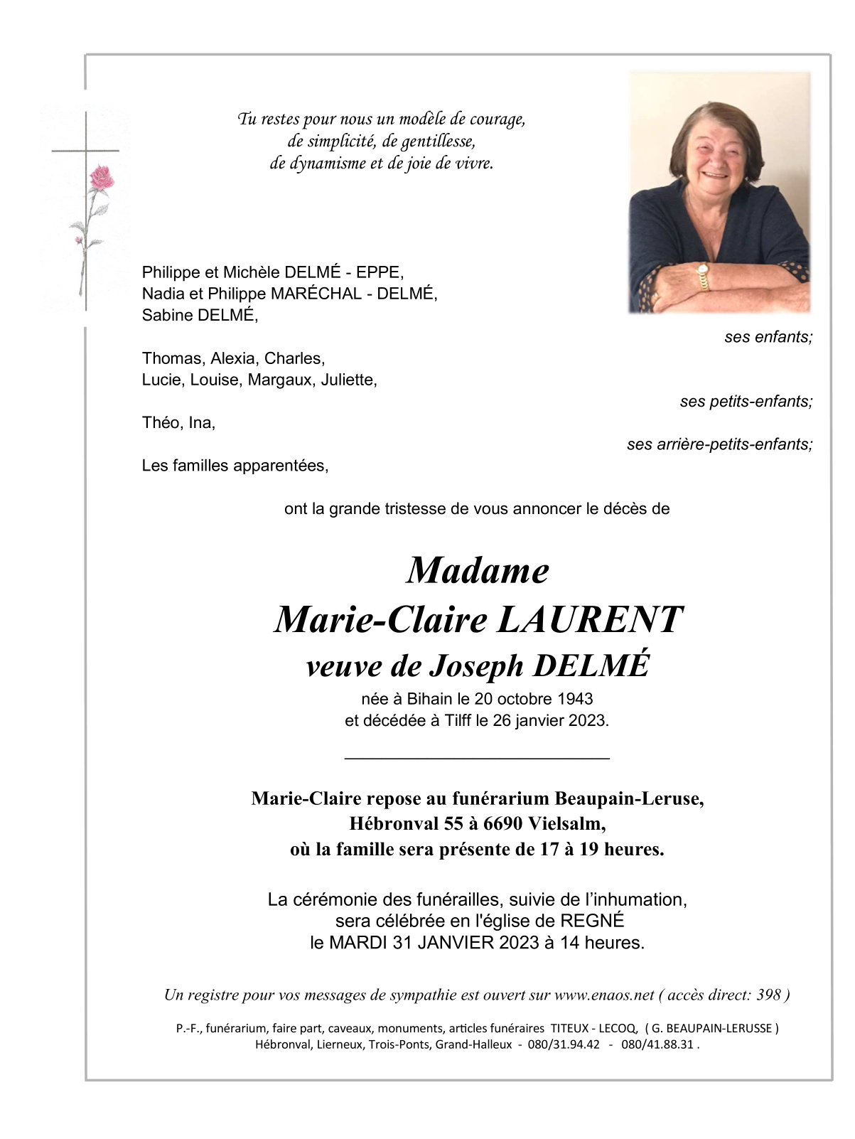 Décédée à Tilff (4130) le jeudi 26 janvier 2023 à l'âge de 79 ans
