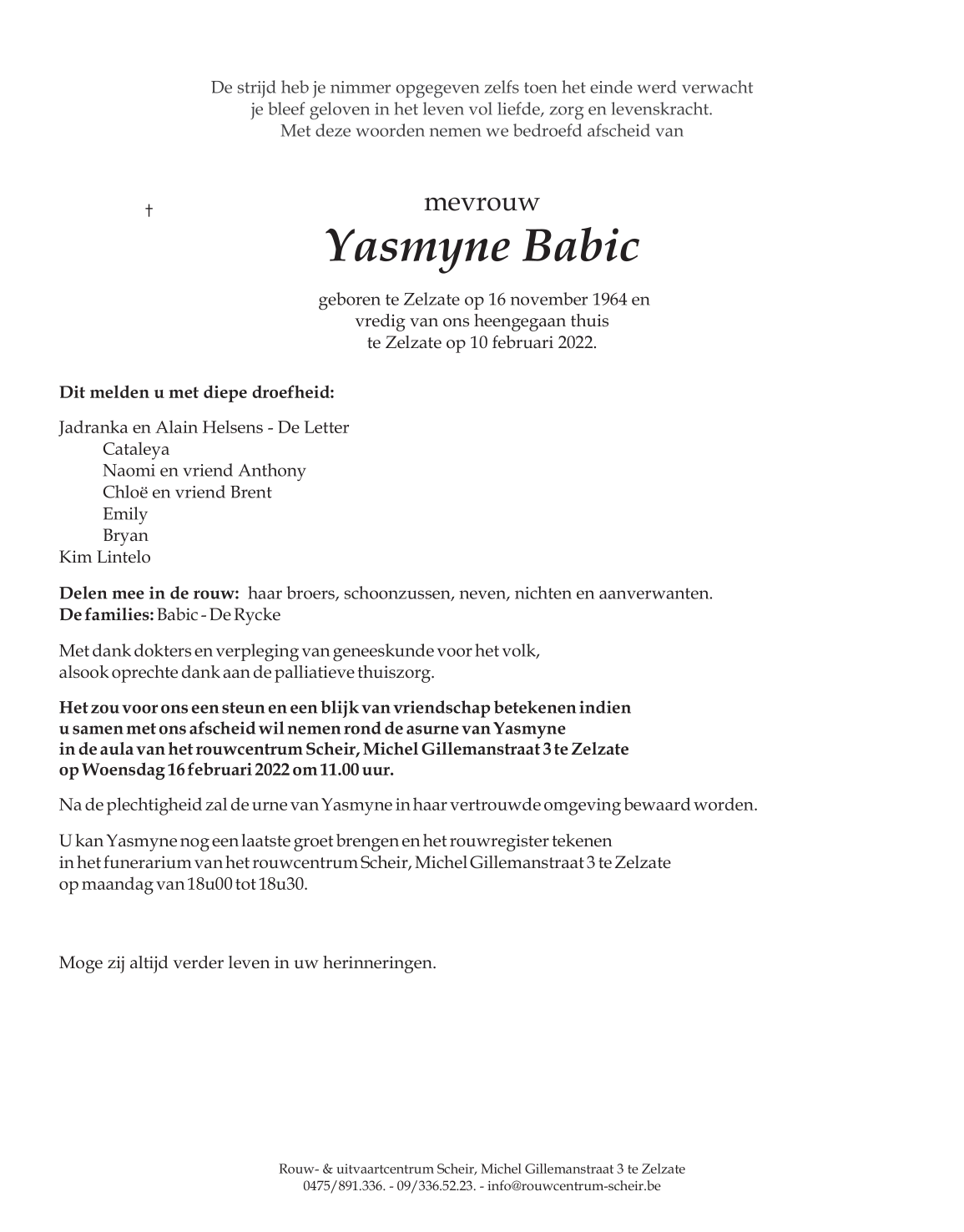 Fallecida en Zelzate (9060) el jueves, 10 de febrero de 2022 a la edad de 57 años