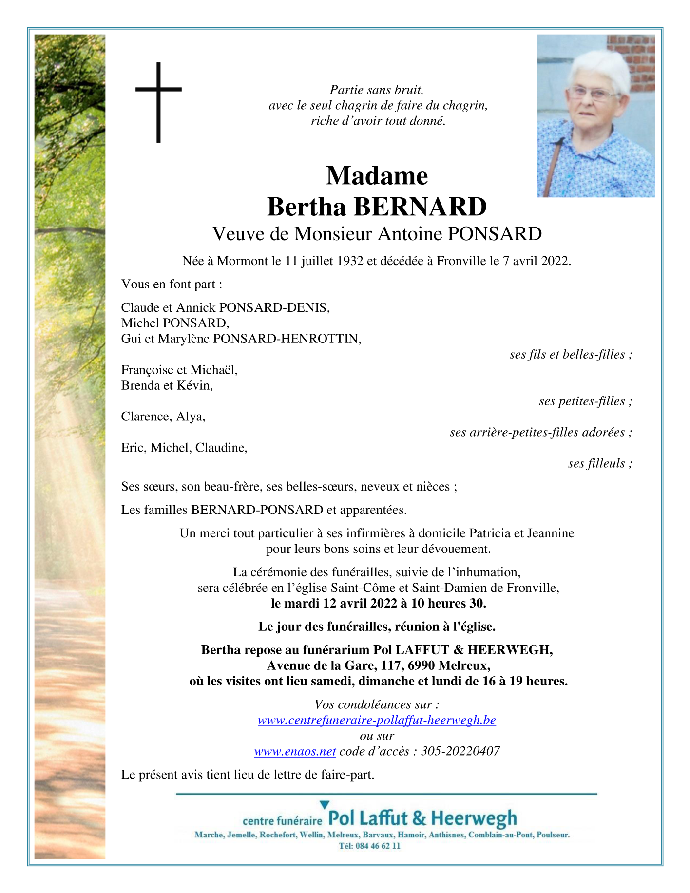 Overleden te Fronville (6990) op donderdag 7 april 2022 op 89-jarige leeftijd