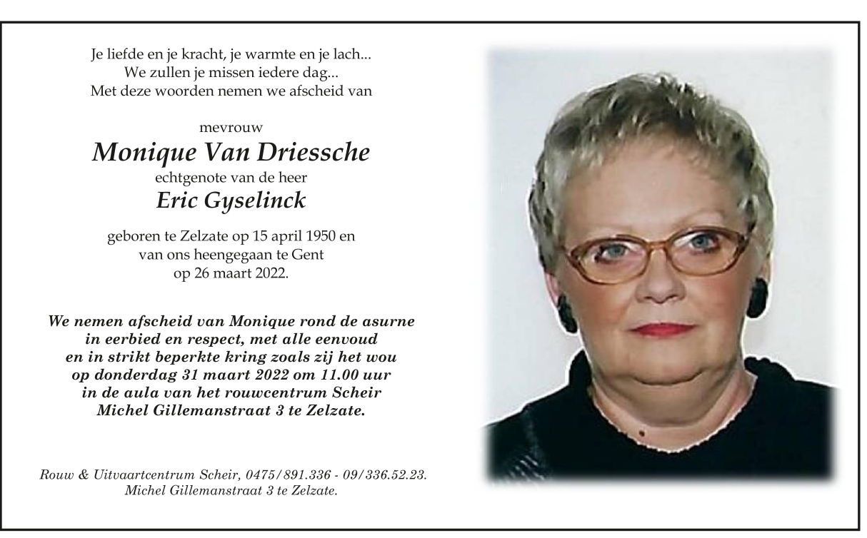 Fallecida en Gent (9000) el sábado, 26 de marzo de 2022 a la edad de 71 años