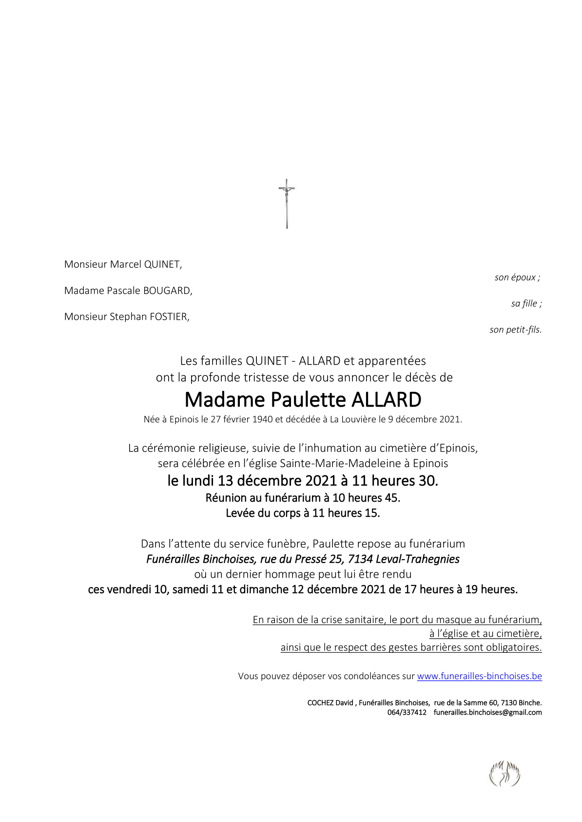 Décédée à La Louvière (7100) le jeudi 9 décembre 2021 à l'âge de 81 ans
