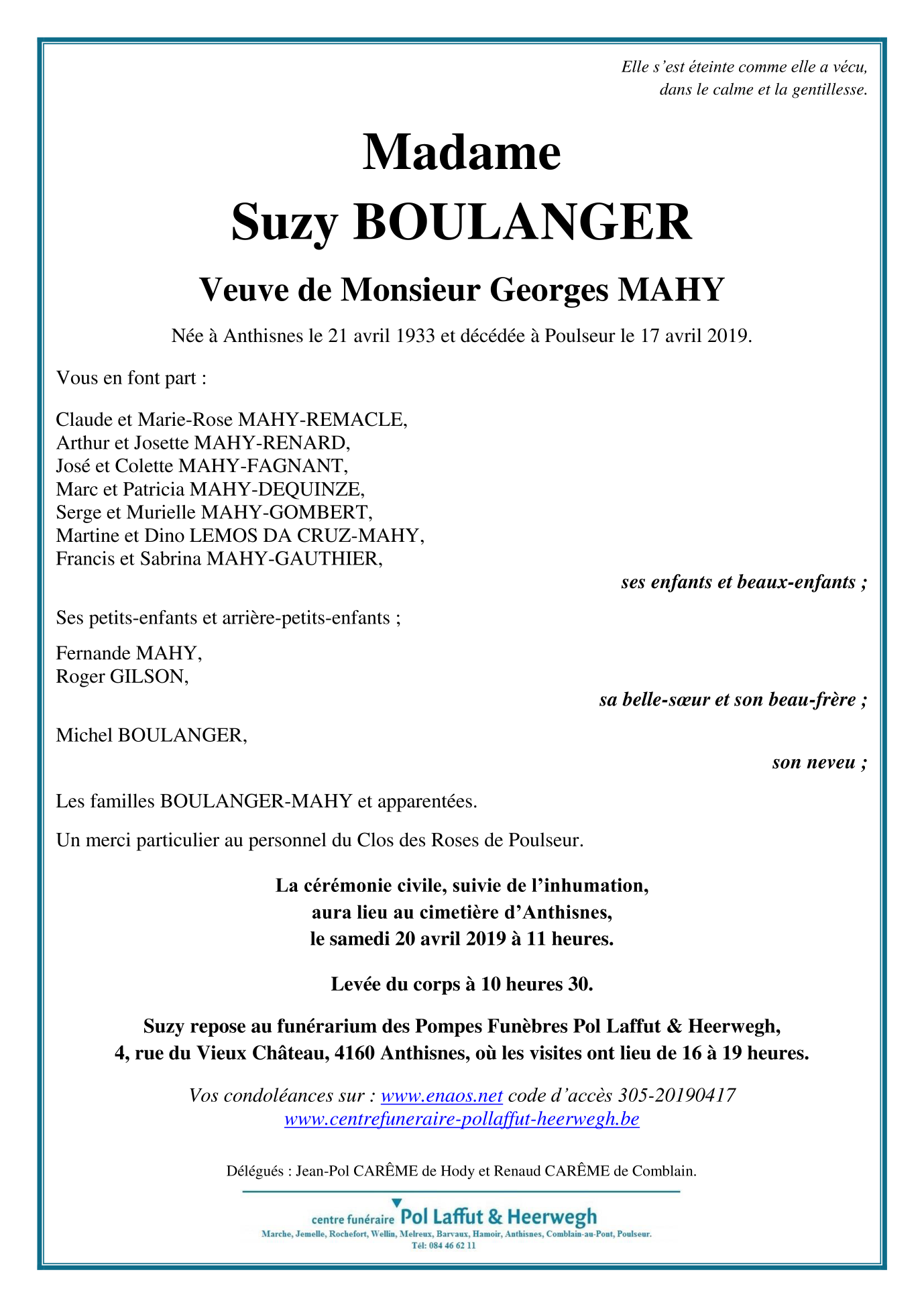 Overleden te Poulseur (4171) op woensdag 17 april 2019 op 85-jarige leeftijd