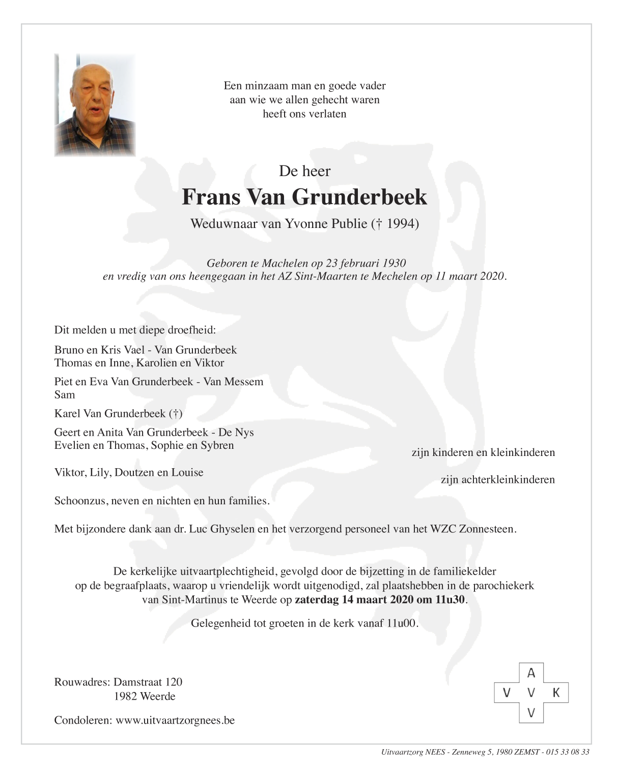 Décédé à Mechelen (2800) le mercredi 11 mars 2020 à l'âge de 90 ans
