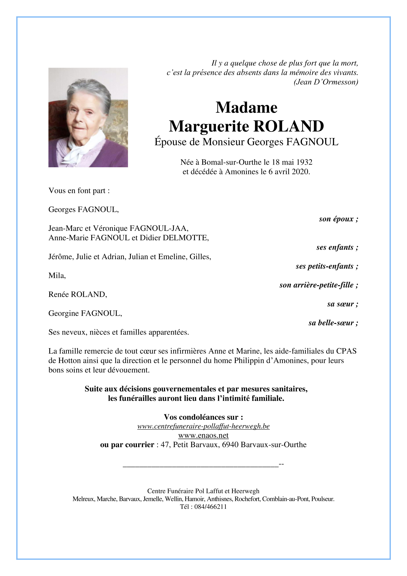 Décédée à Amonines (6997) le dimanche 5 avril 2020 à l'âge de 87 ans
